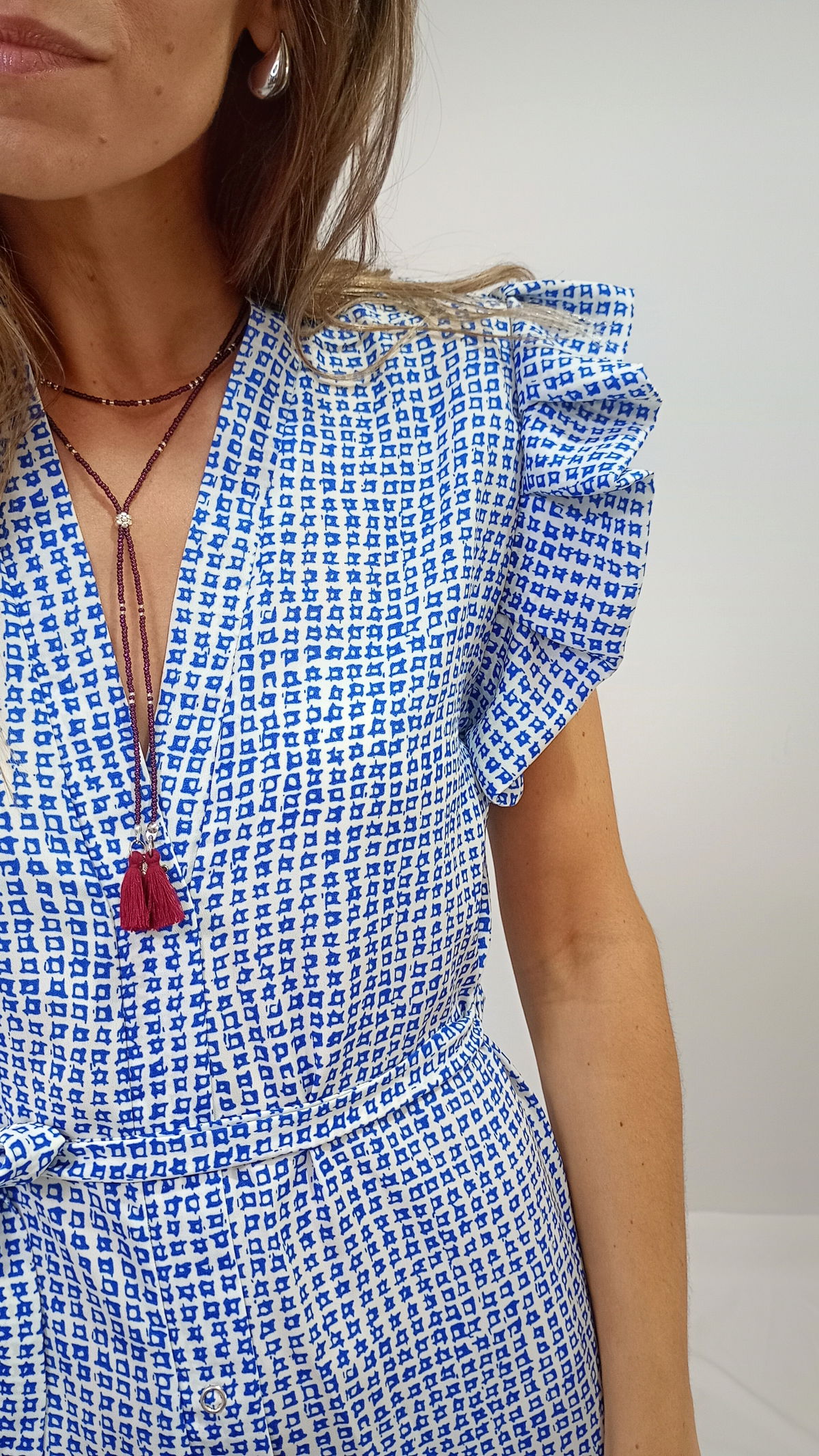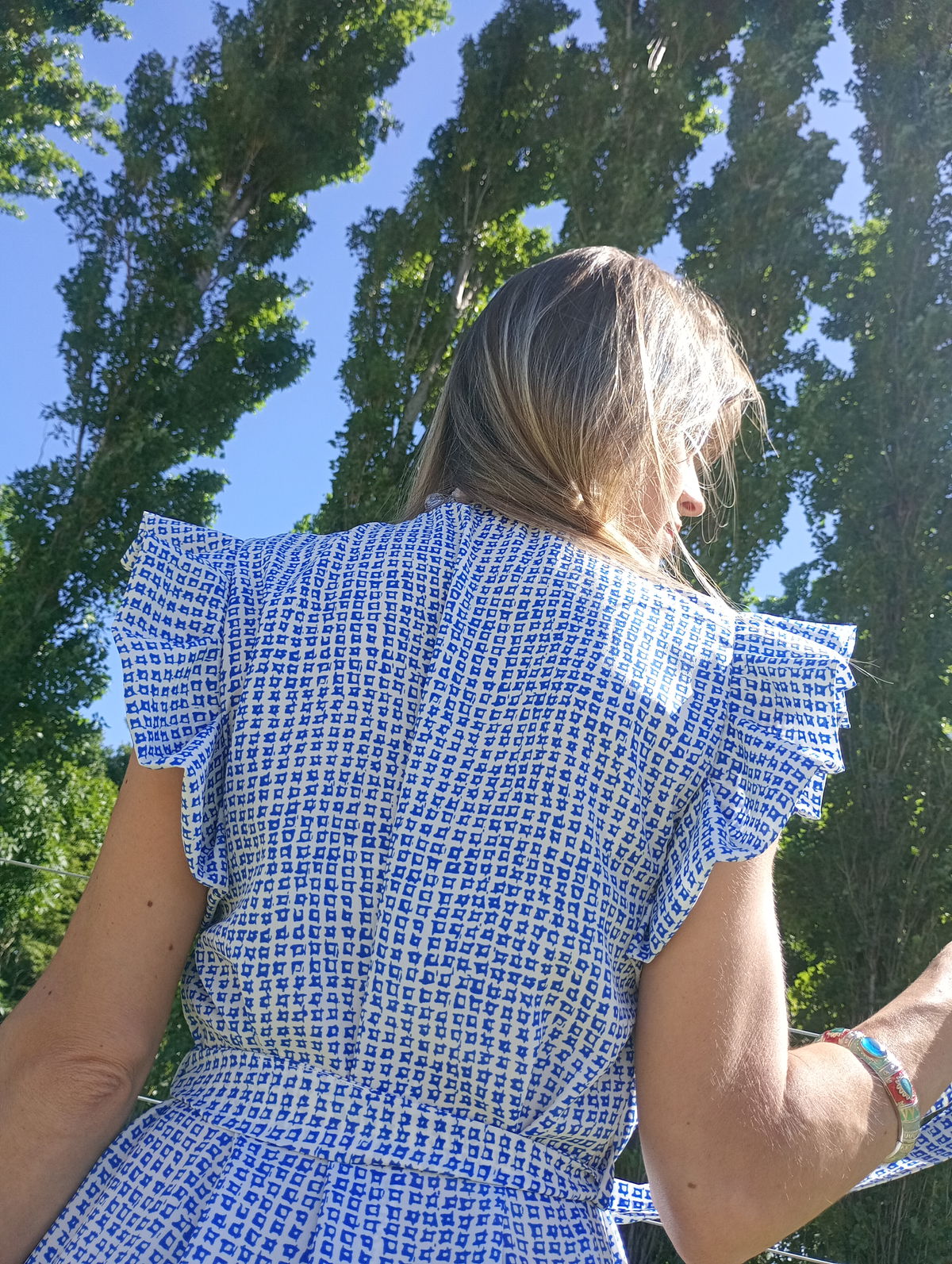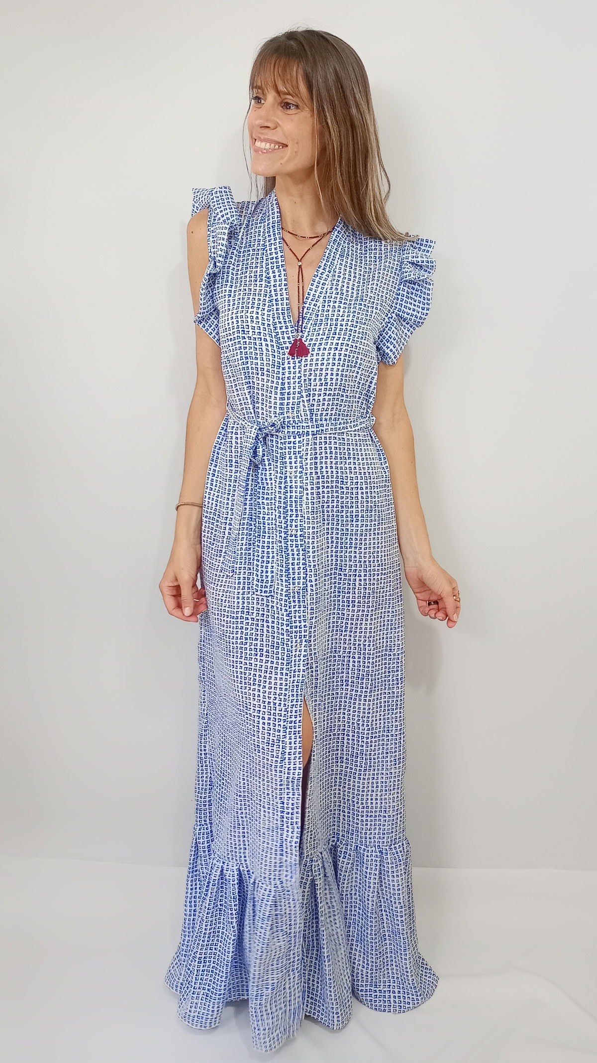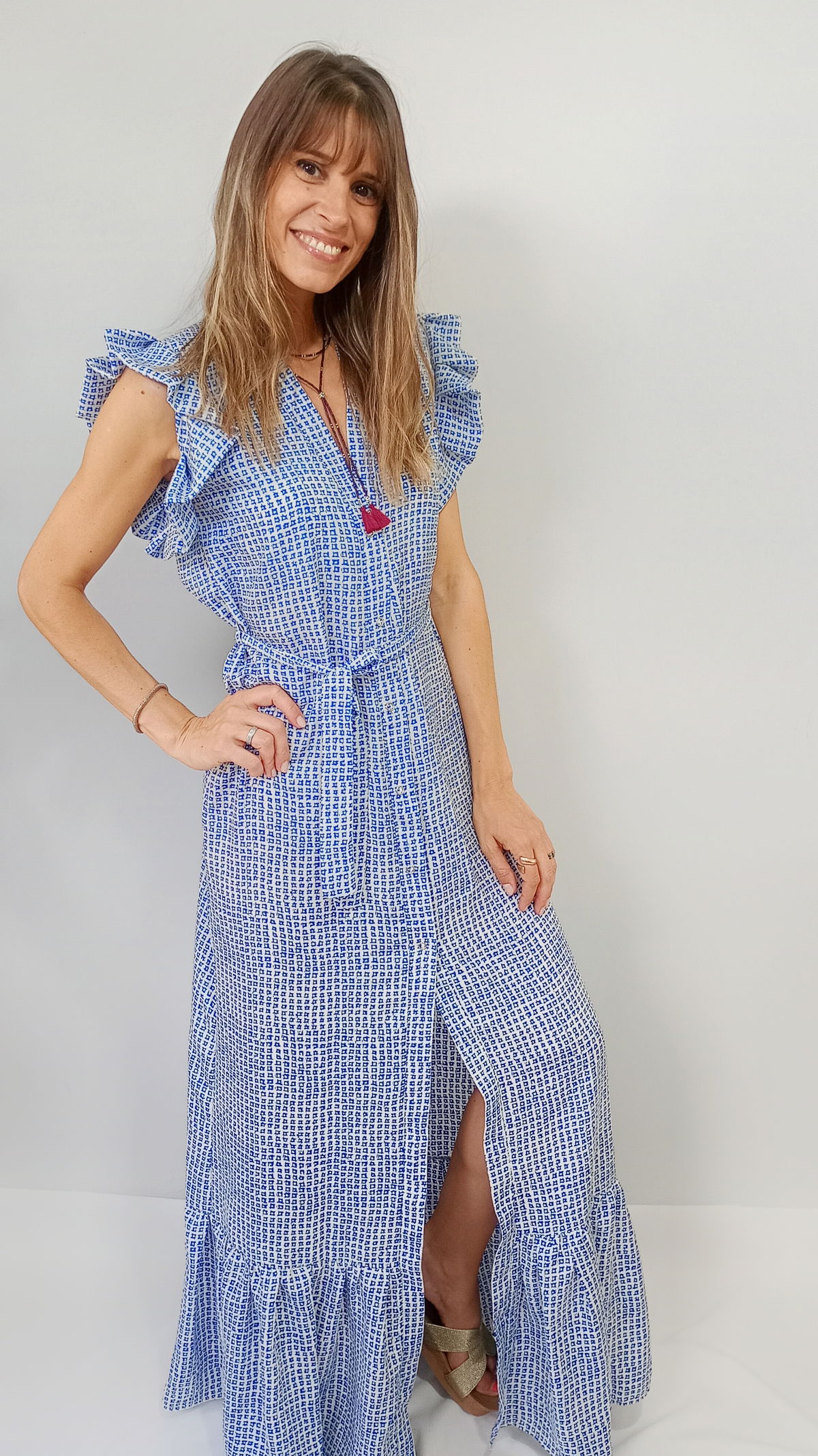Vestido largo con abertura frontal y cartera con broches de presión. Volado de frunce en inferior, y volado tipo tablas en sisa, con doble tela, dando un detalle diferencial. Incluye lazo y pasador en cintura. Textil satén opaco, liviano, estampado en blanco y azul.