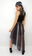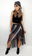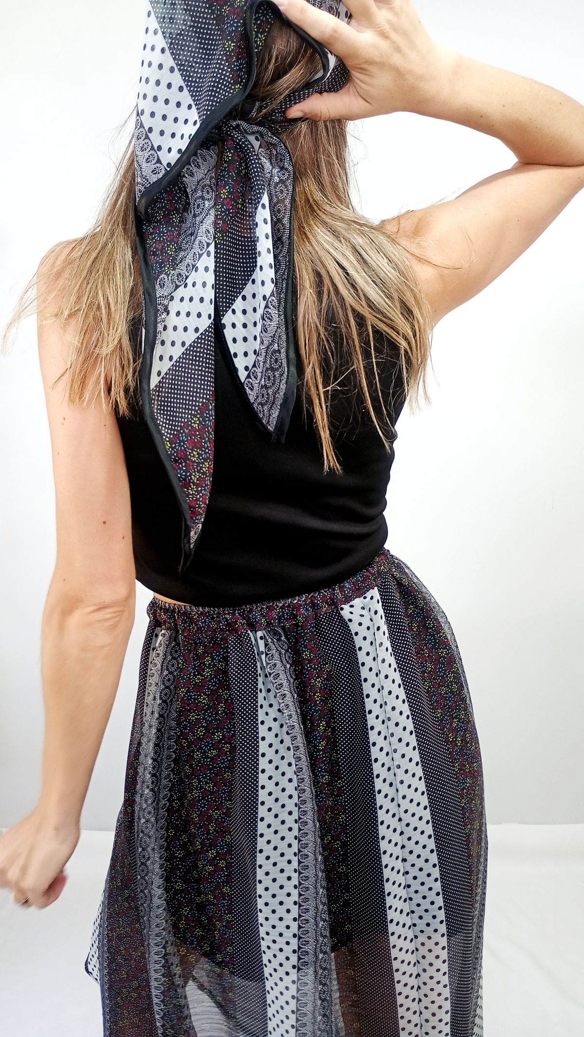 Su textil es gasa estampada, con franjas de distintos motivos, como pequeños lunares. Muy buena fluides y el corte de la moldería genera volumen y movimiento