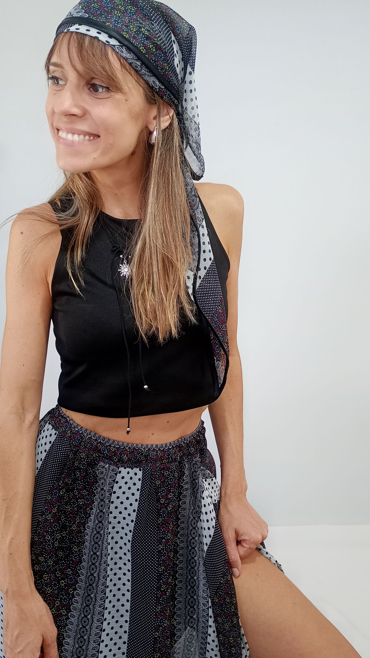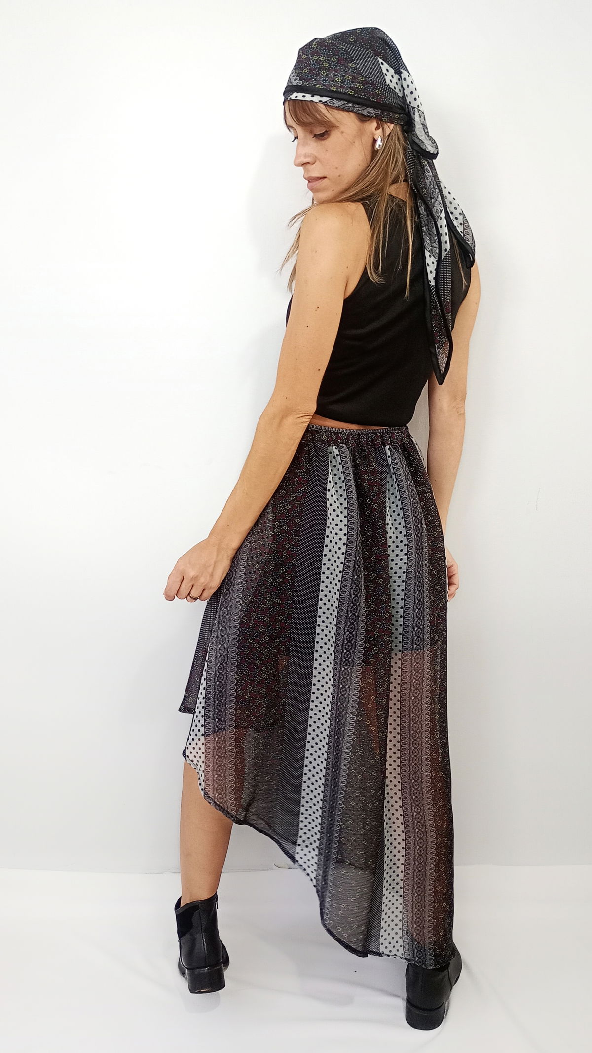 Falda de largo irregular, no tiene una posición específica, podes colocar la parte mas corta donde quieras. Tiene cintura ceparada con elastico interno de 2,5cm. Incluye forrería interna corta(tipo mini) en color negro, unida en cintura.