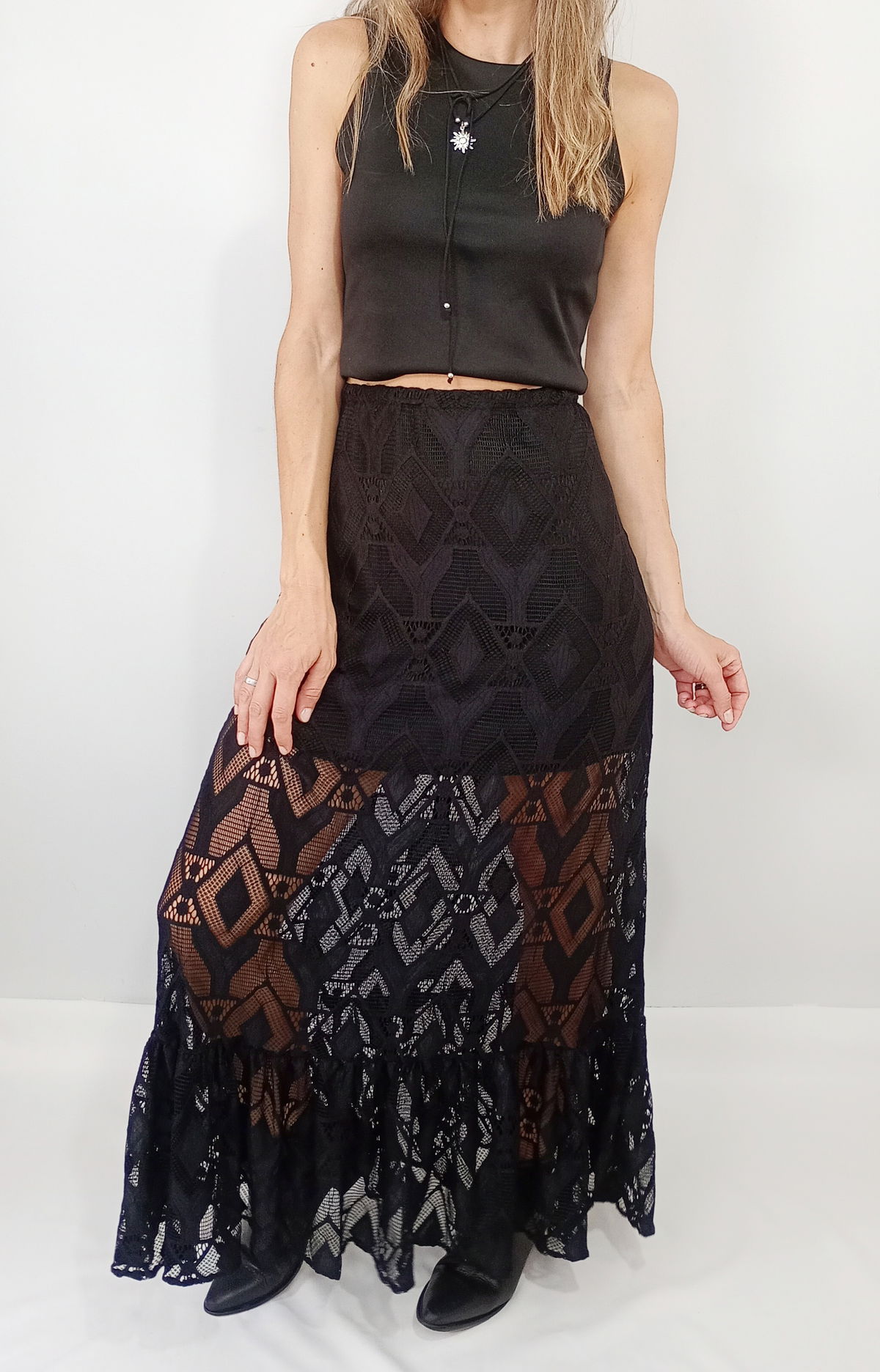 Falda larga, con volado de frunce inferior. Tiene elástico en cintura escondido (con mayor funce en espalda, para que la parte delantera no genere pliegues). Forrería interna corta, unida en cintura, de textil liviano(tipo primera piel) color negro.